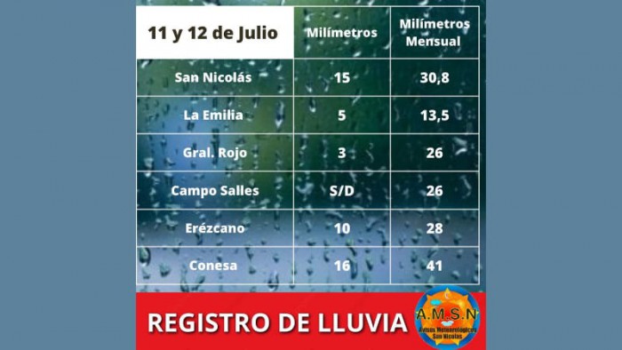Avisos Meteorológicos San Nicolás informa que el agua caída en la madrugada y mañana del miércoles sobre San Nicolás fue de 15 mm. Durante el mes de Julio el registro de lluvia para nuestra ciudad es de 30,8 mm.
