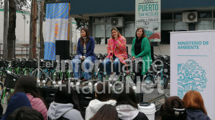 La presidenta del Consorcio de Gestión del Puerto de San Nicolás y precandidata a intendenta, Cecilia Comerio, y la ministra de Ambiente, Daniela Vilar, entregaron esta mediodía más de 200 bicicletas a estudiantes que idearon y llevaron adelante distintas iniciativas en el marco de un Proyecto de Movilidad Sustentable para la ciudad, que organizó la cartera ambiental.