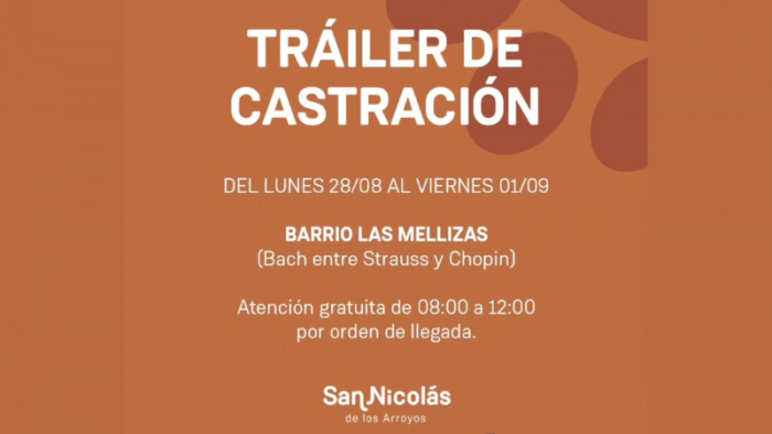 Desde el lunes 28 de agosto al viernes 1 de septiembre, el tráiler de castración y vacunación antirrábica de la Municipalidad estará en barrio Las Mellizas en calle Bach, entre Strauss y Chopin. La atención será de 8.00 a 12.00 horas, por orden de llegada.