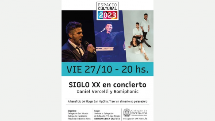 El Colegio de Escribanos de San Nicolás presenta "Siglo XX en concierto", Daniel Vercelli y Romiphonic. Este acto cultural se realizará el viernes 27/10 a las 20 hs a beneficio del Hogar San Hipólito en la Delegación San Nicolás, calle De la Nación 219.