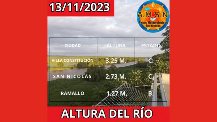 Según el último reporte del Instituto Nacional del Agua (INA), la altura del Paraná no va a superar los 3 metros en San Nicolás. Además, indicó que el promedio que se espera en la cuidad es de 2,76 metros para noviembre, 2,77 metros en diciembre y volvería a descender a en enero de 2024.