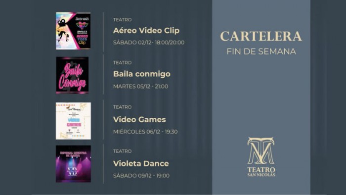 Durante los próximos días, la cartelera del Teatro San Nicolás se renueva con espectáculos a cargo de diferentes instituciones que cierran el año con diversas muestras.