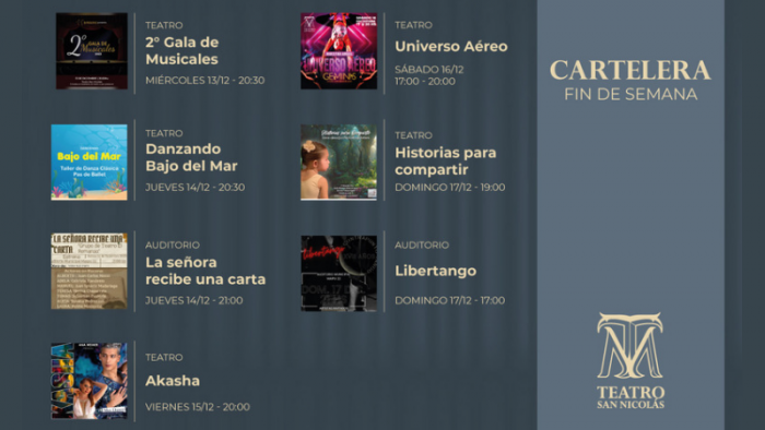 Durante los próximos días, la cartelera del Teatro San Nicolás continuará presentando las muestras de fin de año de distintos grupos culturales de nuestra ciudad.
