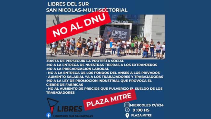 En San Nicolás, la concentración se realiza desde las 9 de la mañana en la Plaza Mitre, convocados por el movimiento Libres del Sur. Además, participan Movimiento Evita, Corriente Clasista y Combativa (CCC), Movimiento de Trabajadores Excluidos (MTE), Juventud CCC, JP Evita y Ni un Pibe y Piba menos por la Droga.