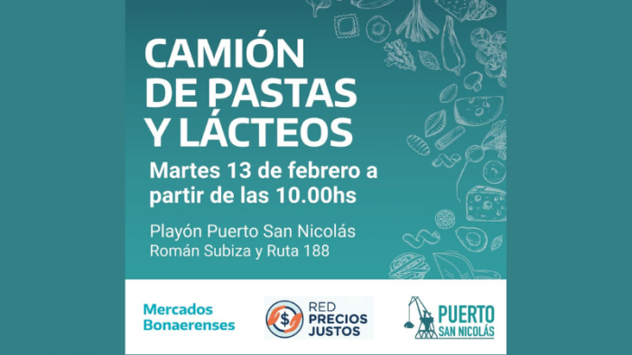 El próximo martes 13 de febrero, a partir de las 10.00 de la mañana, el camión de pastas y lácteos estará en el playón de estacionamiento del Puerto San Nicolás, en Román Subiza y Bogado.