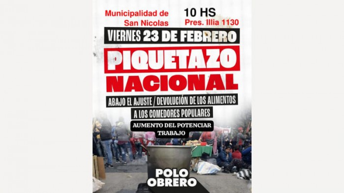 Este viernes 23 de febrero a las 10 hs, el Polo Obrero convocó a una manifestación en la Municipalidad de San Nicolás ubicada en Pres. Illia 1130, en el marco de un piquetazo nacional, solicitando la devolución de los alimentos a los comedores populares y el aumento del Potenciar Trabajo.