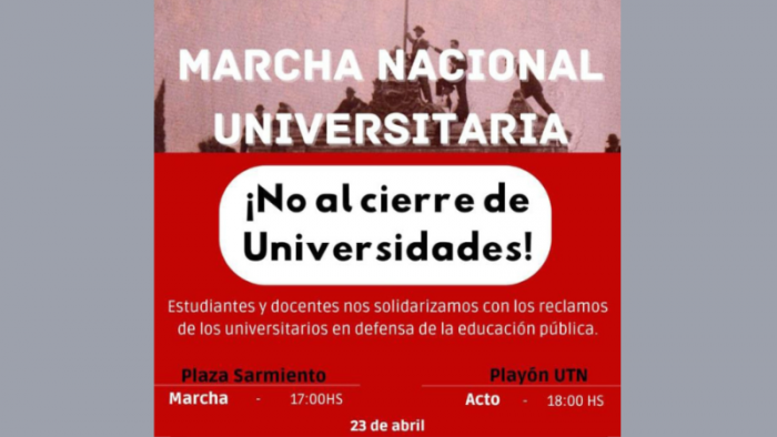Este martes 23 de abril se llevará a cabo una marcha de protesta a nivel local contra el recorte presupuestario a las universidades. La manifestación partirá a las 17hs desde la plaza Sarmiento y a las 18hs se concretará el acto en el playón de la UTN.