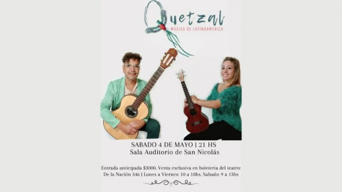 Por otro lado, el Dúo Quetzal actuará el mismo sábado a las 21:00 en el Auditorio Municipal (Maipú 22). José Luis y Javiera presentan toda la música de Latinoamérica en un espectáculo único de canto y cuerdas.