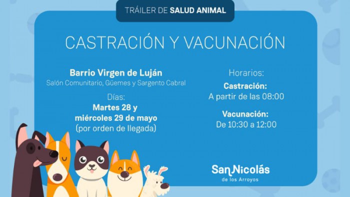 El martes 28 y miércoles 29 de mayo, el tráiler de castración y vacunación de la Municipalidad se encontrará brindando el servicio en el Salón Comunitario de Barrio Virgen de Luján, ubicado en Güemes y Sargento Cabral. La atención es gratuita y por orden de llegada.
