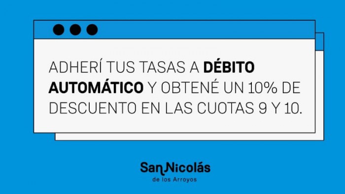 La Municipalidad de San Nicolás informa que está vigente el formulario para acceder a un descuento en las tasas municipales. Los contribuyentes que se adhieran a esta forma de pago, obtendrán un 10% de descuento en las dos primeras cuotas a debitar.