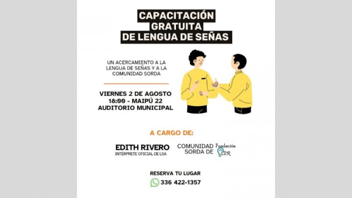 El próximo viernes 2 de agosto a las 18:00 se realizará una capacitación de Lengua de Señas en el Auditorio Municipal (Maipú 22).