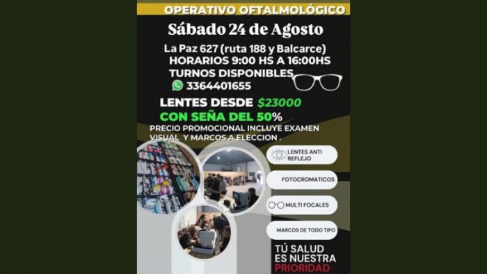Se ofrecerán lentes desde $23.000 con seña del 50%. El precio promocional incluye examen visual y marcos a elección.