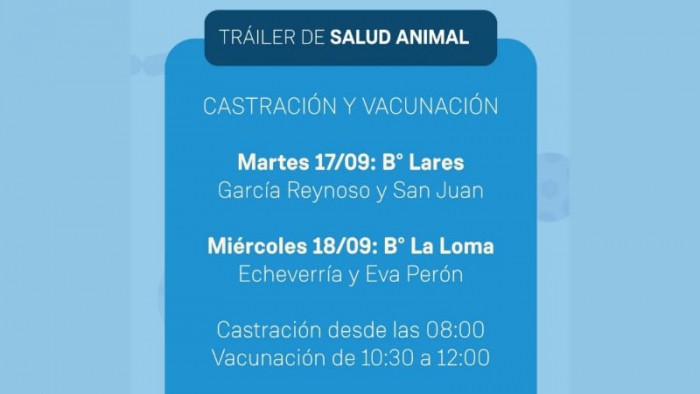 El martes 17 de septiembre estará ubicado en García Reynoso y San Juan, barrio Lares, mientras que el miércoles 18 brindará el servicio en Echeverría y Eva Perón, barrio La Loma.