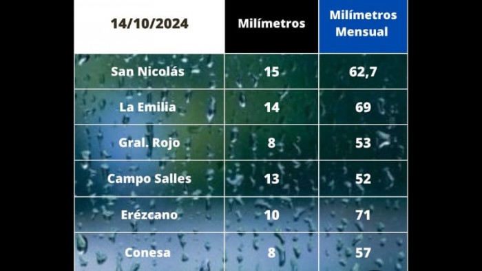 Avisos Meteorológicos San Nicolás informa que el agua caída durante la jornada del pasado lunes 14 de octubre en San Nicolás fue de 15 mm. Durante el mes de octubre el registro de lluvia para nuestra ciudad es de 62,7mm.