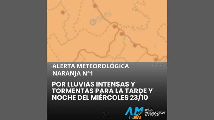 El Servicio Meteorológico Nacional emitió una alerta naranja N°1 por lluvias intensas y tormentas para la tarde y noche del miércoles 23 de octubre.