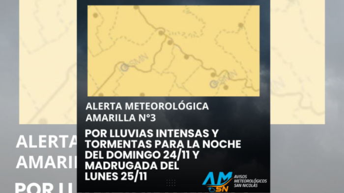 El Servicio Meteorológico Nacional emitió un alerta meteorológico por lluvias intensas y tormentas para la noche del domingo 24 y madrugada del lunes 25.