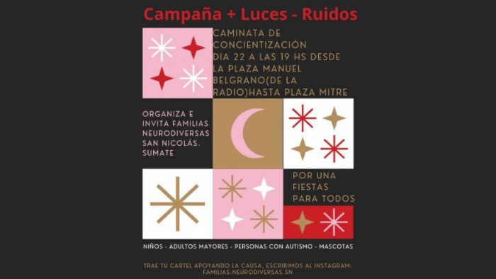 Organiza e invita Familias Neurodiversas San Nicolás. “Entre todos podemos hacer que nuestras fiestas no sean una tortura. Porque la pirotecnia lastima, pedimos más luces, menos ruidos. A difundir, que recorra todos los celulares de la ciudad. Inundemos las redes con esta invitación”, comunicaron.