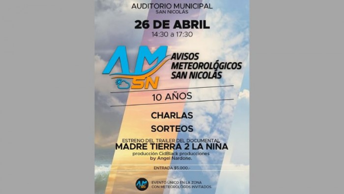 Por los 10 años de su creación, Avisos Meteorológicos San Nicolás invita a la comunidad a un evento único en la zona y en la región que se realizará el sábado 26 de abril de 14:30 a 17:30 horas en el Auditorio San Nicolás.