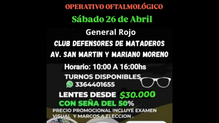 El sábado 26 de abril, de 10.00 a 16.00 horas, se desarrollará en Av. San Martin y Mariano Moreno, Club Defensores de Mataderos (General Rojo), las pruebas de test visual gratuitas y trámites de cristales a precios accesibles.