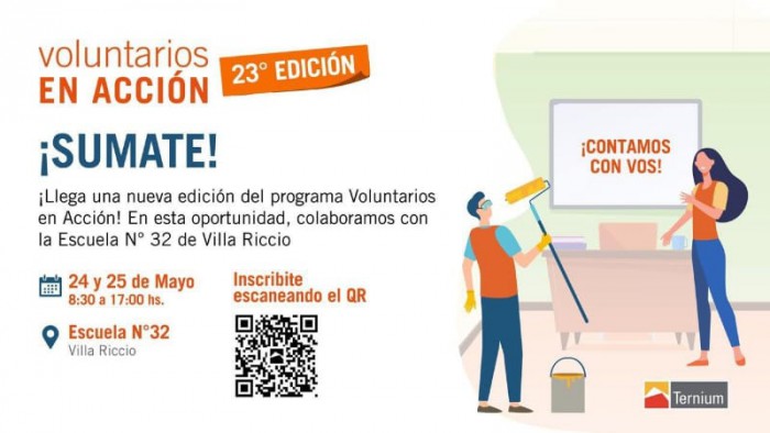 Ternium invita a participar el fin de semana del 24 y 25 de mayo a colaborar con la Escuela N°32 de Villa Riccio, de 8:30 a 17:00 hs, en el marco de una nueva edición del programa Voluntarios en Acción.