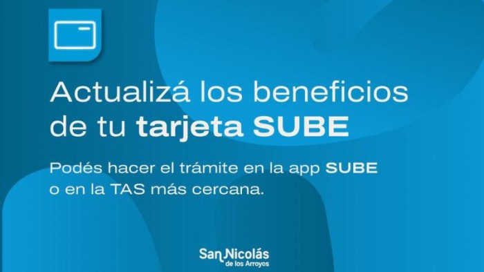 Tener la Tarjeta SUBE actualizada garantiza la vigencia de los beneficios. Es por eso que la Municipalidad de San Nicolás informa que en los próximos días todas aquellas personas que cuentan con estos beneficios (estudiantes, docentes y auxiliares) deberán actualizar su tarjeta. El trámite se puede realizar desde la app SUBE o en una Terminal Automática.