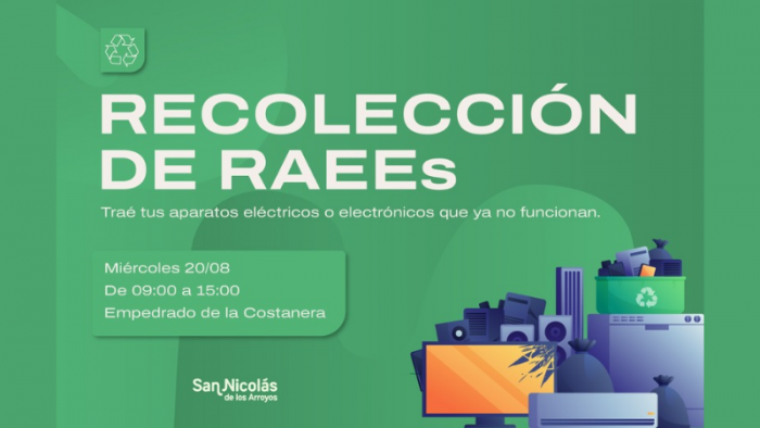 La Municipalidad de San Nicolás realizará este miércoles 20 de agosto, una nueva campaña de recolección de Residuos de Aparatos Eléctricos y Electrónicos (RAEE).