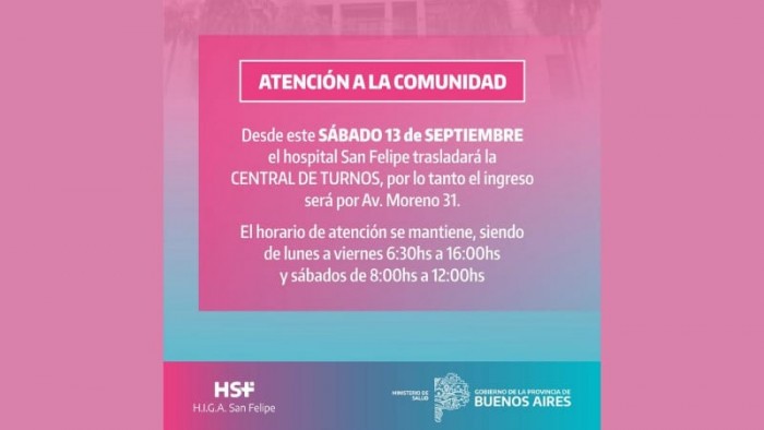 El Hospital San Felipe informa que el sábado 13 de septiembre trasladará la central de turnos, por lo que el ingreso será por Av. Moreno 31.