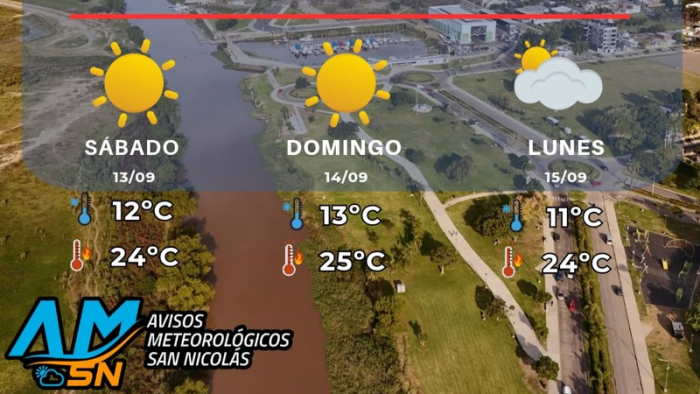 Sábado 13/09: mínima de 12°C y máxima de 24°C, con cielo despejado y ambiente templado.