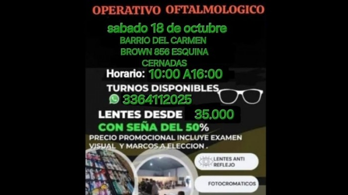 Se ofrecen lentes desde $35.000 con seña del 50%. El precio promocional incluye examen visual y marcos a elección.
