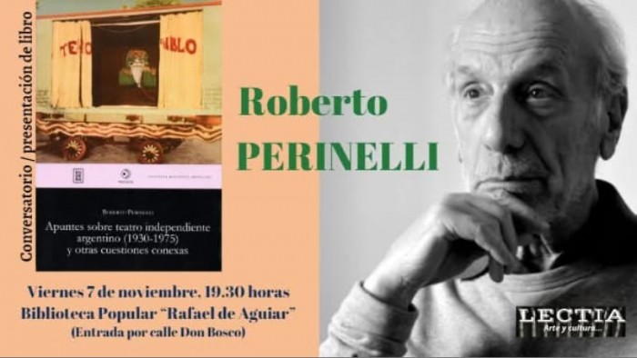 El reconocido dramaturgo argentino Roberto Perinelli estará el viernes 7 de noviembre, a las 19.30 horas en la Biblioteca Popular "Rafael de Aguiar" de San Nicolás para presentar su libro "APUNTES SOBRE TEATRO INDEPENDIENTE ARGENTINO (1930-1975) y otras cuestiones conexas" (editado por EUDEBA). También participará de un conversatorio abierto al público. Organiza: LECTIA / ARTE Y CULTURA.