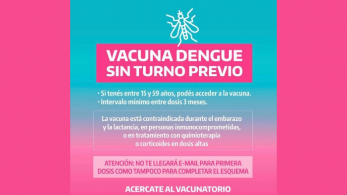 El Hospital San Felipe informa que aquellas personas entre 15 y 59 años pueden acceder a la vacuna contra el dengue sin turno previo. Se detalló que el intervalo mínimo entre dosis es de tres meses.