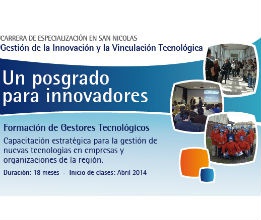 El GTEC Centro - Este informa que está abierta la inscripción para una nueva edición de la Carrera de Especialización en Gestión de la Innovación y la Vinculación Tecnológica, que se dictará en la ciudad de San Nicolás. La nueva cohorte estará a cargo la Facultad Regional San Nicolás de la UTN y el comienzo de clases está previsto para el mes de abril de 2014.