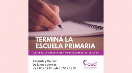Casa de Encuentro Comunitario Inmaculada Concepción informa que hasta el viernes 16 de septiembre está abierta la pre-inscripción para personas mayores de 18 años que deseen finalizar sus estudios primarios. Es totalmente gratuita