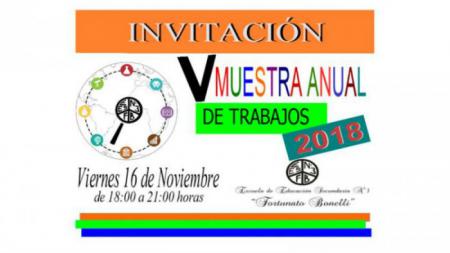 Las autoridades educativas de la Escuela Secundaria N° 3 Fortunato Bonelli invitan a la Muestra Anual que se realizará el viernes 16 de noviembre en el horario de 18 a 21 horas. en el establecimiento ubicado en Nación 186.
