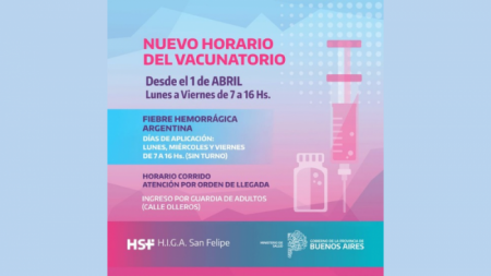 Desde el mes de abril, el vacunatorio del hospital San Felipe tendrá un nuevo horario. Los días de atención serán de lunes a viernes de 7:00 a 16:00hs y será por orden de llegada.