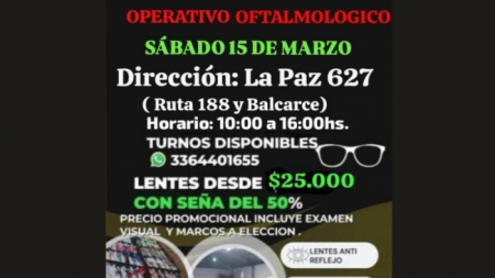 El sábado 15 de marzo, de 10.00 a 16.00 horas, se desarrollarán en la calle La Paz 627, entre Ruta 188 y Balcarce, las pruebas de test visual gratuitas y trámites de cristales a precios accesibles.