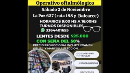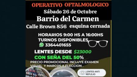 Se realizará el sábado 26 de octubre de 9:00 a 16:00 en calle Brown 856, esquina Cernada, en Barrio Del Carmen. Se ofrecerán lentes desde $23.000 con seña del 50%.