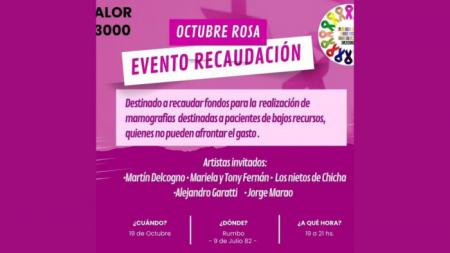 En el marco de Octubre Rosa, el próximo 19 de octubre, de 19:00 a 21:00 hs, se realizará un evento de recaudación para la realización de mamografías destinadas a pacientes de bajos recursos.