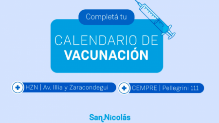 La Municipalidad de San Nicolás, recuerda que todas las vacunas están disponibles en los diferentes centros de salud de la ciudad. La vacunación puede realizarse de lunes a viernes en el horario de 7:00 a 17:00.