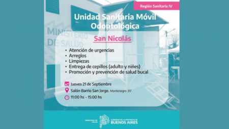 Mañana jueves 21 de septiembre arribará la Unidad Sanitaria Móvil Odontológica en el barrio San Jorge. Allí se atenderá por orden de llegada de 11 a 15hs en Montenegro 317 (Salón comunitario).