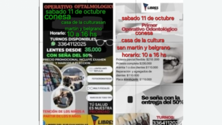 Libres del Sur reprogramó el servicio de venta de anteojos a precios accesibles y el operativo odontológico. Se realizarán juntos el próximo sábado 1 de noviembre.