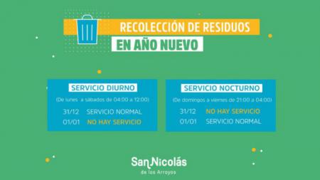 La Municipalidad de San Nicolás informa que, debido al feriado del 1 de enero, habrá cambios en la frecuencia de recolección de residuos sólidos urbanos.
