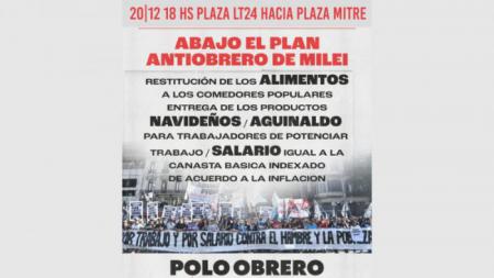 El 20 de diciembre integrantes del Polo Obrero se reunirán en la Plazoleta Belgrano, ubicada en Av. Moreno y Lavalle, a las 18 hs y marcharán hacia Plaza Mitre, manifestándose bajo el lema "Abajo el Plan antiobrero de Milei".