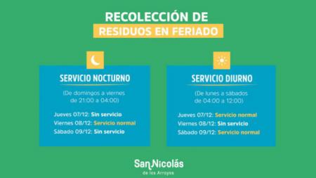 La Municipalidad de San Nicolás informa que, debido al fin de semana largo por el Día de la Inmaculada Concepción de María, habrá cambios en la recolección de residuos sólidos urbanos en las diferentes zonas de la ciudad.