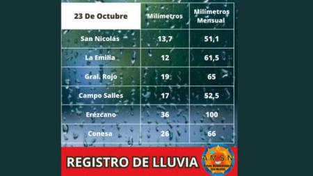Avisos Meteorológicos San Nicolás informa que el agua caída durante el día lunes 23 de Octubre en San Nicolás fue de 13,7 mm. Durante el mes de Octubre el registro de lluvia para nuestra ciudad es de 51,1 mm.
