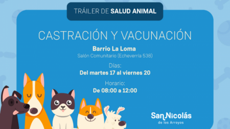 El tráiler de castración y vacunación de la Municipalidad estará hasta el viernes 20 de octubre en el salón comunitario de barrio La Loma. La atención es gratuita y por orden de llegada en el horario de 8:00 a 12:00.