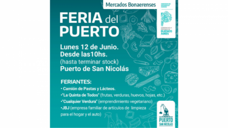 Este lunes 12 de junio a partir de las 10hs se llevará a cabo la “Feria del Puerto”, en el Puerto de San Nicolás. La actividad se desarrollará en el playón de estacionamiento (Avda. Román Subiza y Bogado).