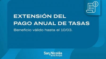 La Municipalidad informa que, hasta el 10 de marzo, los contribuyentes podrán realizar el pago anual de Tasas Municipales con un descuento del 6% tanto para la de Desarrollo Urbano como para la de Aguas San Nicolás.