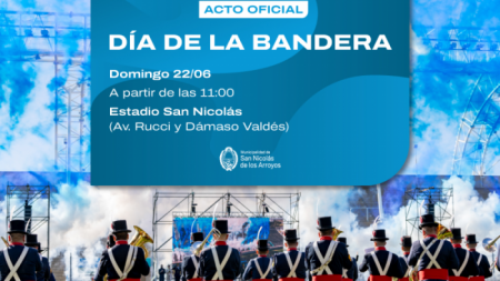 El domingo 22 de junio a las 11:00 en el Estadio San Nicolás se realizará el acto oficial por el Día de la Bandera, en conmemoración de un nuevo aniversario del paso a la inmortalidad del Gral. Manuel Belgrano.
