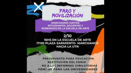 Este miércoles 2 de octubre, estudiantes, docentes y egresados de la Escuela de Arte se movilizarán desde la plaza Sarmiento hacia la UTN en el marco de la segunda marcha universitaria que se realizará a nivel nacional.